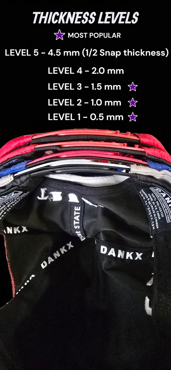 Thickness levels range from LEVEL 1 (Thinnest 0.5 mm) – LEVEL 5 (Thickest 4.5 mm). The distance between each snap on a snapback closure is generally 9 mm so our level 5 Snapback liner option will create 1/2 of a snap thickness.